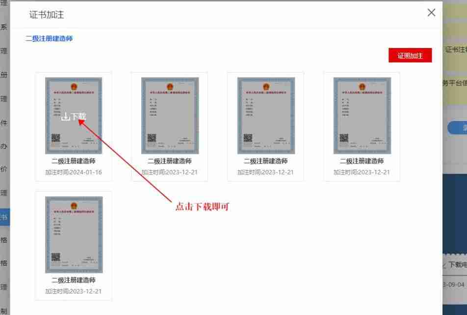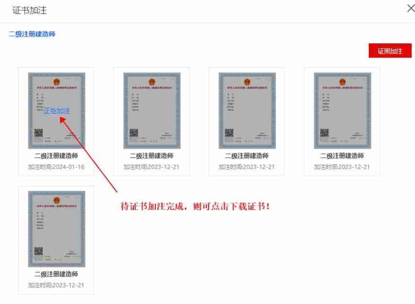 人員登錄【江西住建云】個人服務(wù)平臺,在【我的證書】模塊內(nèi),找到二級注冊建造師電子證書。下載證書的操作流程如:點(diǎn)擊【下載電子證書】按鈕,通過微信小程序掃碼認(rèn)證后,點(diǎn)擊【證書加注】。待證書加注成功后,即可下載電子證書。