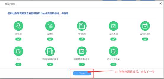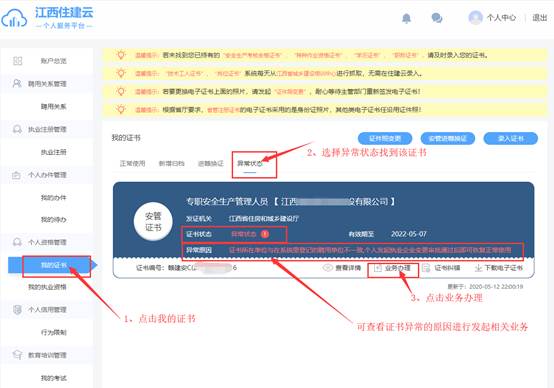 當執(zhí)證人員因單位調(diào)動,需要辦理證書變更業(yè)務時,在“證書詳情”頁面,點擊“執(zhí)業(yè)企業(yè)變更”,系統(tǒng)自動檢測本人實名制認證、上傳證件照、聘用關系登記、無在辦理業(yè)務等條件,各項條件滿足,申請單由證書所在單位確認后才會提交至相關業(yè)務部門審查,審查完成后簽發(fā)電子證書,實現(xiàn)“一次不用跑”。操作流程:【我的證書】→【異常狀態(tài)】→【業(yè)務辦理】→【執(zhí)業(yè)企業(yè)變更】→【證書所在單位確認】→【業(yè)務提交至主管部門審核】,如下圖: